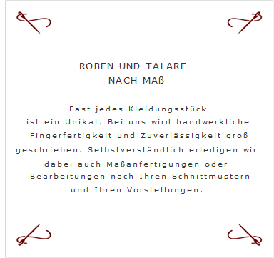 Erstklassige Konfektion, exquisite und einzigartige Verarbeitung feinster und edelster Stoffe in Kombination mit erstklassiger Beratung unter Berücksichtigung individueller Wünsche - diese Eigenschaften spiegeln sich in den Roben von TIMELESS | bespoken wider. Roben und Talare für ein einzigartiges Trage-Erlebnis Von hochwertigen Justiz- und akademischen Roben bis hin zu eleganten kirchlichen Talaren für Damen und Herren. TIMELESS | bespoken steht für zeitlose Stoffe und Modelle aus eigener Herstellung mit höchsten Qualitätsansprüchen. Unsere Stoffe unterliegen allerhöchsten Standards, die wir fortlaufend eingehend prüfen. Für das Weben verwenden wir besonders langfaserige Wolle, die eine der feinsten Garnstärken ergibt. Dadurch erhalten wir ein Tuch mit geringfügig hervorstehenden Fasern und höchsten Tragekomfort. Unsere Justiz und akademischen Roben werden durch die Verarbeitung feinster und edelster Rohstoffe den gehobenen Ansprüchen unserer Kunden gerecht und verleihen dem Amtsträger ein elegantes Ansehen. Neben Justiz Roben bieten wir auch kirchliche Roben für Würdenträger. Bei der Verarbeitung der eleganten Talare verwenden wir Stoffe höchster Güte. Das Gewebe verhält sich besonders atmungsaktiv und verfügt über einen feinen Glanz, der dem Amt kirchlicher Würdenträger gerecht wird. Exquisite Stoffe für Roben höchster Qualität Unseren Kunden bieten wir bei TIMELESS | bespoken für ihre Roben oder Talare verschiedene Stoffe zur Auswahl. So verarbeiten wir Kashimir und Seide edelster Qualität, welche den Roben einen leichten Schimmer verleihen und dank der Leichtigkeit des Stoffes besonders bequem sind. Unsere Merino Wolle beziehen wir aus Neuseeland, von Schafen edelster Züchtung, die eine ultrafeine Wolle liefern. Mit dieser Qualität weben wir ein äußert geschmeidiges Tuch mit natürlicher Elastizität, deren hohe performance-Eigenschaften ideal für Richter- und Anwaltsroben sind. Fast jedes Kleidungsstück stellt aufgrund der sorgfältigen Herstellung durch unsere Schneider ein Unikat dar. Dabei stehen die Schneider unseren Kunden mit fast unerschöpflichen Lösungsmöglichkeiten zur Verfügung, um die Roben wunschgerecht zu gestalten. Gerne übernehmen wir personalisierte Arbeiten, sodass wir Roben genau nach Ihren Modellvorgaben anfertigen und für Sie eine einzigartige und individuelle Robe erstellen. Qualität liegt bei TIMELESS | bespoken im Detail: Passen, Bordüren und Nähte werden mit großer handwerkliche Fingerfertigkeit bearbeitet. So können wir den Anforderungen unserer Kunden nach Perfektion gerecht werden. Wir bieten mehr als Roben Neben Roben und Talaren bieten wir unseren Kundinnen eine vielfältige Auswahl im Bereich Business Kleidung: Sie erhalten bei uns Blusen und Kleider für Damen genau in Ihrer Passform in feinsten Stoffen. Unsere Modelle werden mit größtem Know How und höchster Fingerfertigkeit für unsere Kundinnen gefertigt. Unsere Kleidung wird den Erwartungen einer Dame stets gerecht und besticht durch erstklassigen Tragekomfort. Mit unserer Fülle an Hüten, Schuhen und weitere Accessoires haben wir es uns bei TIMELESS | bespoken zum Ziel gesetzt, das Outfit unserer Kundinnen zu vervollständigen und das gewisse Etwas zu verleihen. Auch den Herren bieten wir eine große Auswahl an Business Kleidung. Wir bei TIMELESS | bespoken bieten den Herren Hemden in komfortabler Passform und hochwertigem Tuch. Auch Sakkos und kompletten Anzüge in klassischem Schnitt, mit sorgfältiger Verarbeitung, gehören zu unserem Produktbereich. Unser Angebot an Top Modellen für den gehobenen Anspruch wird durch unser Sortiment an Schuhen, Hüten und Accessoires abgerundet und sorgt insgesamt für ein perfekt edles Auftreten für den Herren. TIMELESS | bespoken lässt den Kauf von Business Kleidung und Roben zu einem einzigartigen Erlebnis werden. Natürlich liefern wir unsere Produkte gerne zu unseren Kunden nach Hause, wir betrachten es aber auch als besondere Ehre, Sie in unserem Haus willkommen zu heißen und Ihnen persönlich Ihre neue Kleidung zu überreichen. |